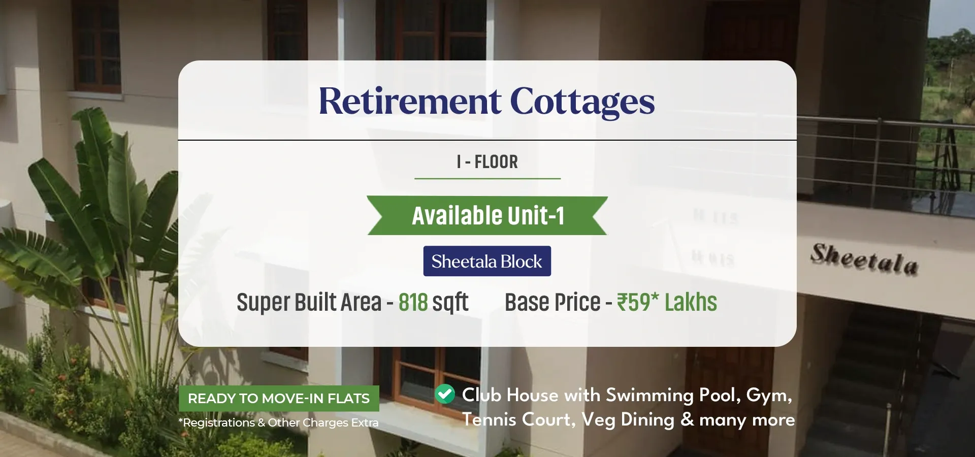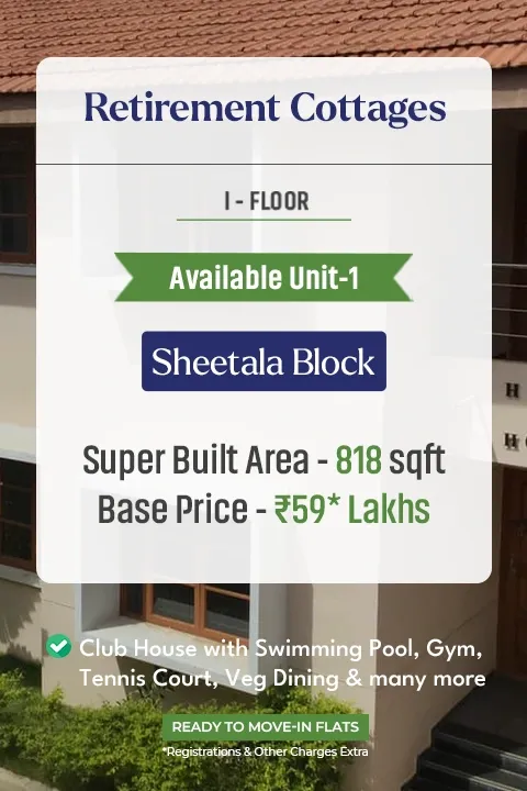 Thoughtfully designed 1 BHK Retirement Homes and Cottages, with select units offering serene views and private balconies. Experience peaceful living in a vibrant community tailored to your comfort and lifestyle.